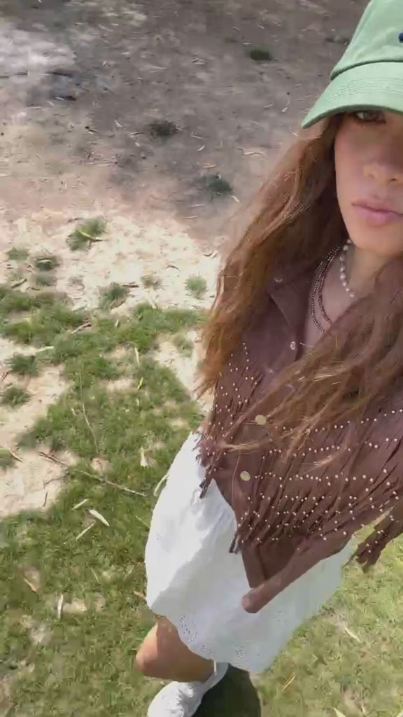 Camisa de botones estilo gamuza, con barbas y estoperoles.