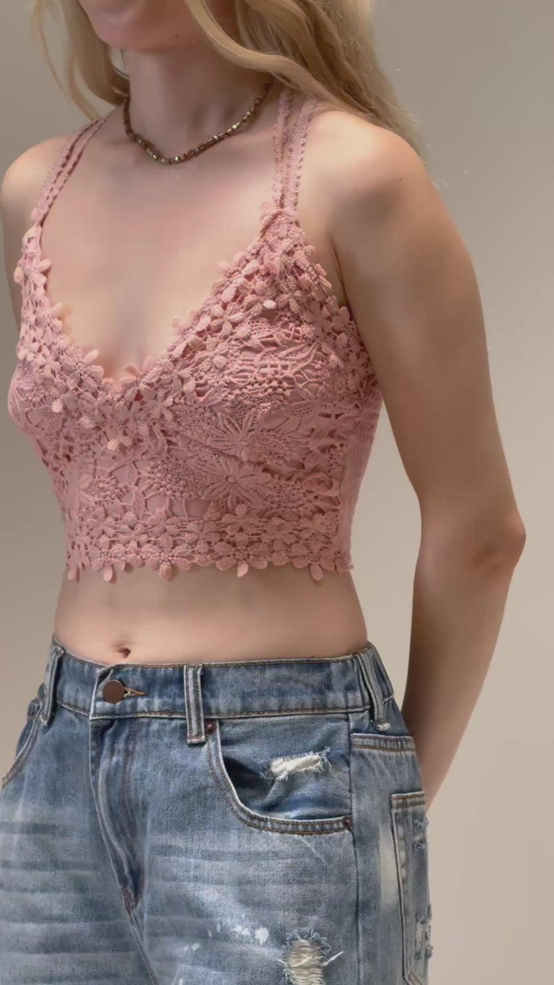 Top tipo Bralette con copas y ajuste en tirantes, frente de tira de algodón tipo encaje y resorte en espalda.