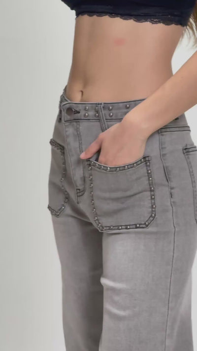 Pantalón de mezclilla gris corto con strech con bolsas al frente y estoperoles