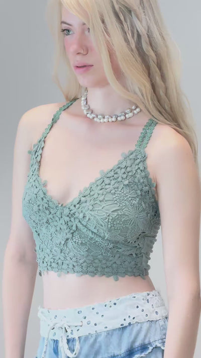 Top tipo Bralette con copas y ajuste en tirantes, frente de tira de algodón tipo encaje y resorte en espalda.